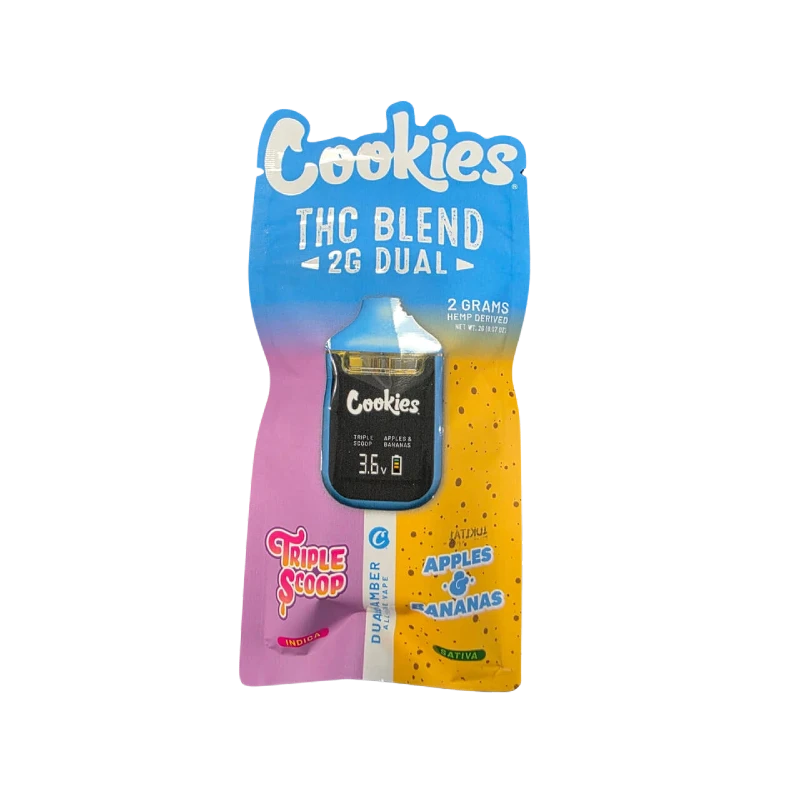 La vainilla cremosa de Triple Scoop y la fruta tropical de Apples & Bananas se encuentran en un perfil que no existiría si solo tuvieras uno de los dos. El limoneno dominante de Triple Scoop se mezcla con el mirceno y cariofileno de Apples & Bananas para crear algo más redondo, más complejo, con esa base frutal-cremosa que cuesta dejar. Los que conocen los terpenos van a entender por qué Cookies eligió específicamente esta combinación para el dual chamber.